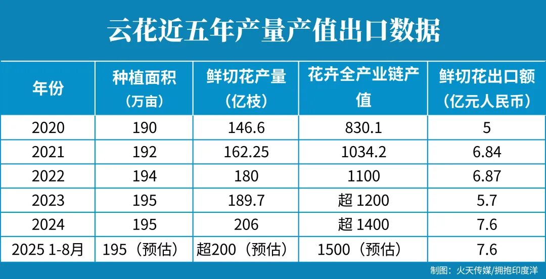 外贸口径最能说明现代产业的成色。近年来,云花出海高歌猛进。在我国鲜切花出口第一梯队(云南、浙江、福建合计占比80.9%)中,云南“亿枝独秀”,创下出口值连续六年全国第一的佳绩。