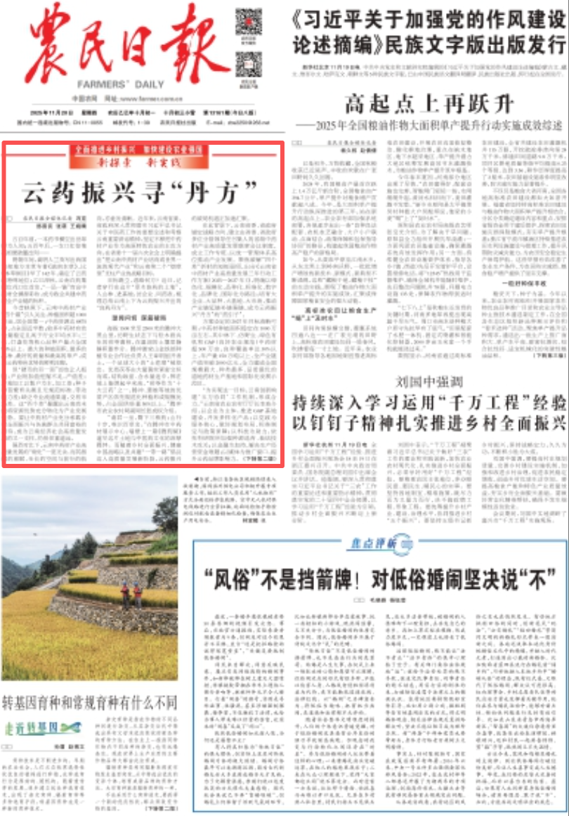 放眼全省,云南已初步构建良种繁育推广体系,建成多个省级药用植物种质资源圃,实现“十大云药”新品种全覆盖,选育登记品种100余个、审定良种5个。云南白药集团实施“云药种谷”计划,建立“育—繁—推—用”全链条协同体系,采用“一个品种+一个专家团队+3~5家合作伙伴”模式,开展云木香、三七等12个品种的新品种选育。
