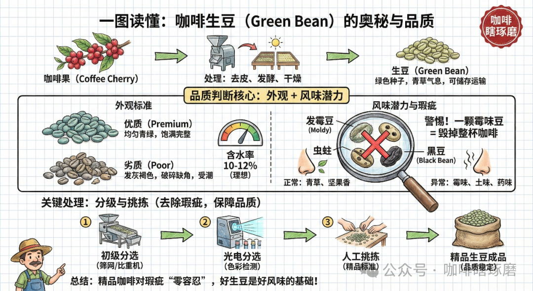判断生豆品质,就像看水果一样,主要看外观 + 内部风味潜力。