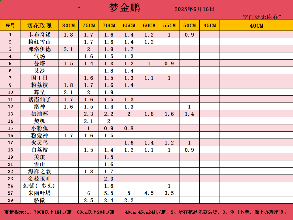 注:小量订购最低多品种混搭满6KG(10扎花左右),装一箱发货